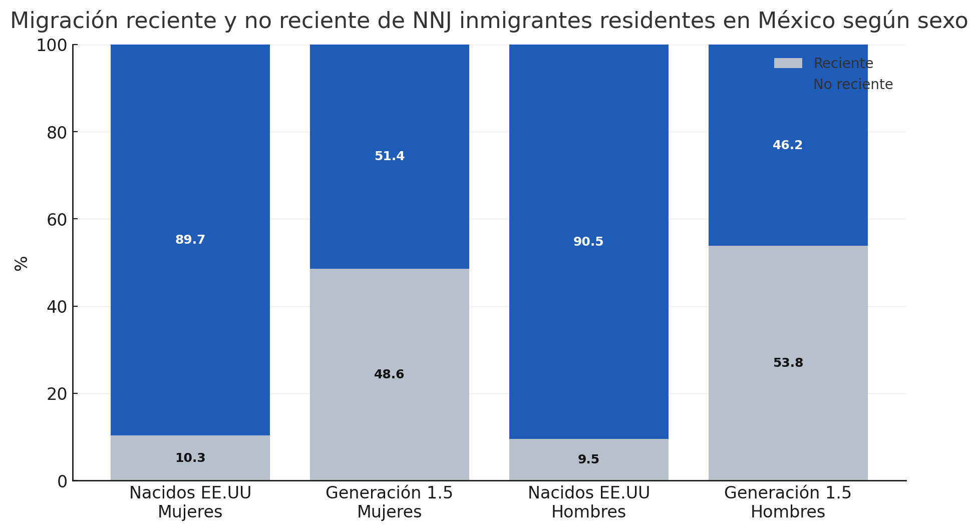 En México, una gran proporción de NNJ no migrantes, inmigrantes e hijos de migrantes participan ampliamente en el sistema educativo, pero existen algunos contrastes entre grupos. Entre 5 y 11 años, los no migrantes, los nacidos en Estados Unidos y los hijos de migrantes con un progenitor mexicano (generación 2.5) tienen porcentajes de participación casi universales —cercanos o superiores al 90.0%—, mientras los NNJ nacidos en el extranjero (generación 1.5) tienen un porcentaje de no asistencia escolar de 20.9%. Los nacidos en México de ambos padres extranjeros (generación 2.0) tienen menores porcentajes de asistencia que sus pares no migrantes o la generación 2.5, pero no llegan a ser tan bajos como los de sus pares nacidos en el extranjero.
