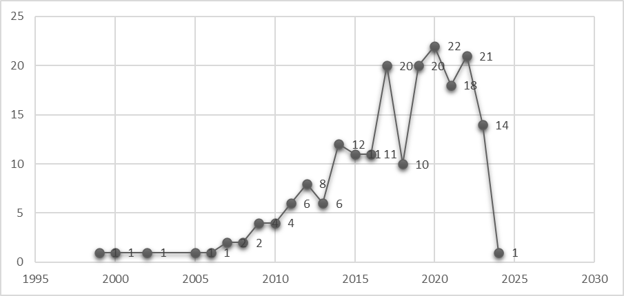 Entre 2000 y 2013 la producción fue escasa, pero a partir de 2014 se observa un crecimiento sostenido con comportamiento intermitente, hasta alcanzar su punto máximo en 2020 con 197 artículos. La disminución registrada en 2024 responde al corte de la búsqueda realizado en abril de ese año, por lo que no refleja necesariamente una tendencia descendente.