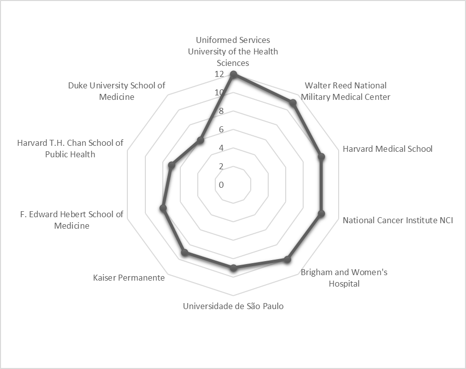 El ranking de las diez revistas con mayor producción científica en este campo muestra que 60% pertenecen al cuartil Q1 del SJR, 30% a Q2 y 10% a Q3. En primer lugar, se ubica PLOS One (EE. UU.) con diez artículos, seguida por BMC Cancer (Reino Unido) con ocho y Breast Cancer Research and Treatment (EE. UU.) con siete. Estos resultados evidencian que las publicaciones de mayor impacto académico concentran la difusión del conocimiento en torno al cáncer y los diagnósticos tardíos.