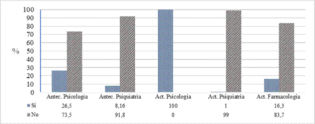 Se encontró (figura 1) que la mayoría de los participantes no contaban con antecedentes psicológicos (73,5%) o psiquiátricos (91,8%) en su historia personal. Respecto a tratamientos actuales en salud mental, se encontró que solo el 1% contaba con acompañamiento por psiquiatra, el 100% se encontraba en procesos terapéuticos en cursos a través de la modalidad de docencia-servicio, y solo el 16,3% contaban con tratamiento farmacológico actual.