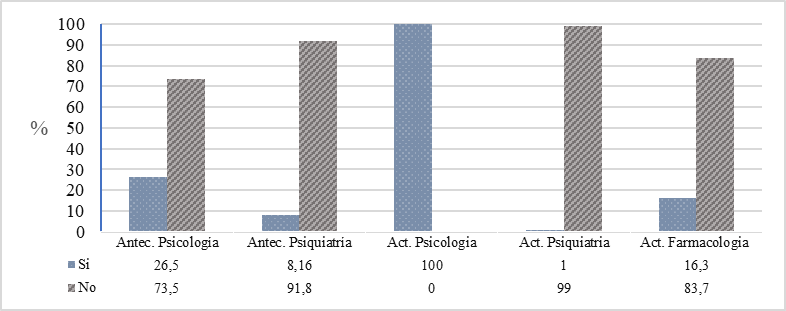 Se encontró (figura 1) que la mayoría de los participantes no contaban con antecedentes psicológicos (73,5%) o psiquiátricos (91,8%) en su historia personal. Respecto a tratamientos actuales en salud mental, se encontró que solo el 1% contaba con acompañamiento por psiquiatra, el 100% se encontraba en procesos terapéuticos en cursos a través de la modalidad de docencia-servicio, y solo el 16,3% contaban con tratamiento farmacológico actual.